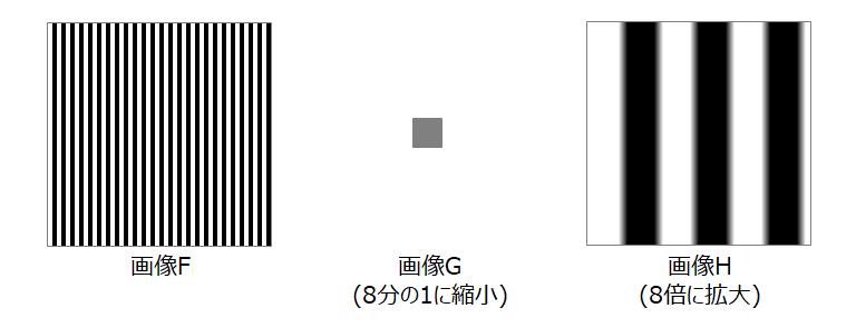 前回は真っ白になった「画像F」の縮小では、白(255)と黒(0)が綺麗に混ざり合ってグレー(128)になりました。
