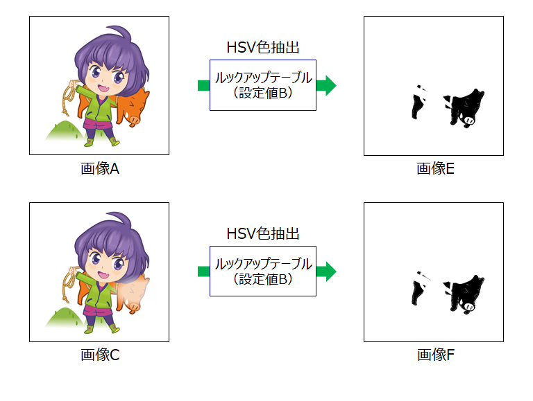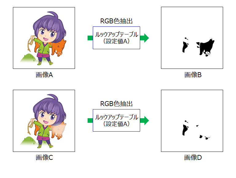 「画像C」は「画像A」の明るさが変化した画像ですが、同一のルックアップテーブル設定値(設定B)でうまく色を抽出できています。