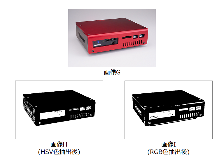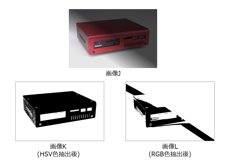 HSV色抽出をした「画像K」は「画像H」とほぼ同じ結果になりましたが、RGB色抽出をした「画像L」は明るさの変化に対応できずに「画像I」とは全く異なる結果になりました。