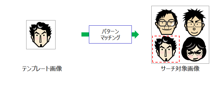 パターンマッチングは、あるパターン画像を画像全体の中から探し出す処理です。あるパターン画像をテンプレート画像と呼びます。テンプレートマッチングと呼ばれる手法では、テンプレート画像と対象画像を照らし合わせて一致度(類似度)を求めます。