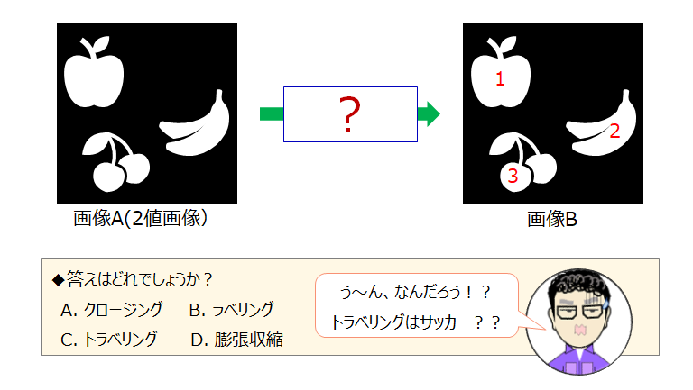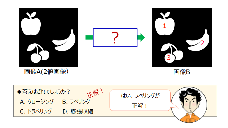「画像A」は2値画像です。2値画像の白い物体に番号を付ける処理を何と呼ぶでしょうか?