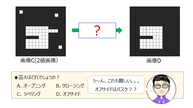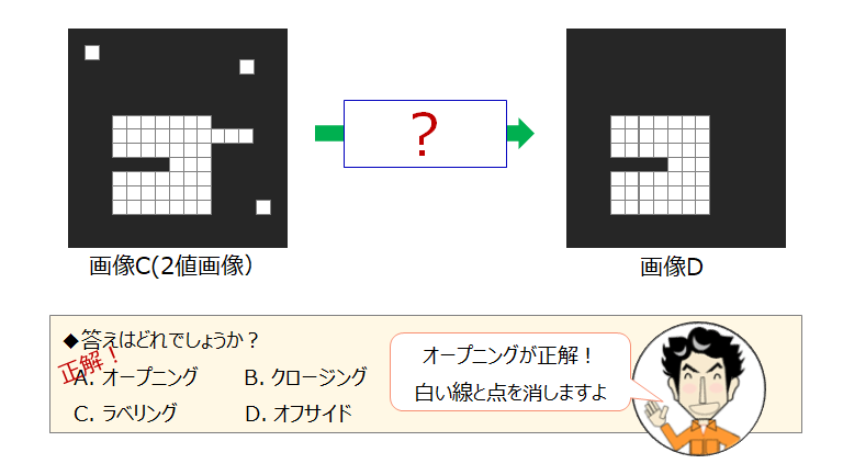 今回の問題に関する詳細な解説は「2値画像の膨張・収縮①」、「2値画像の膨張・収縮②」、「ラベリング①」、「ラベリング②」の記事をご覧ください。
