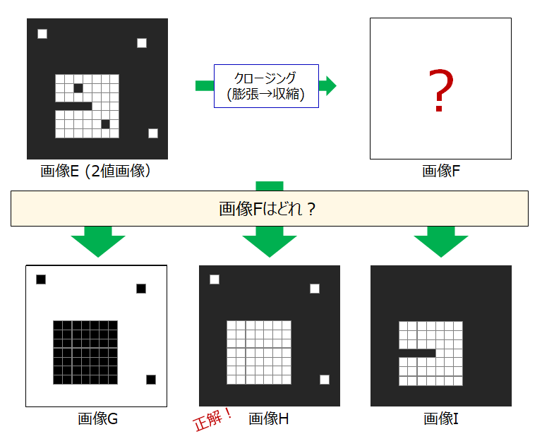 問題3の答えは「画像H」です。クロージングは黒い線と点を消すことができます。
