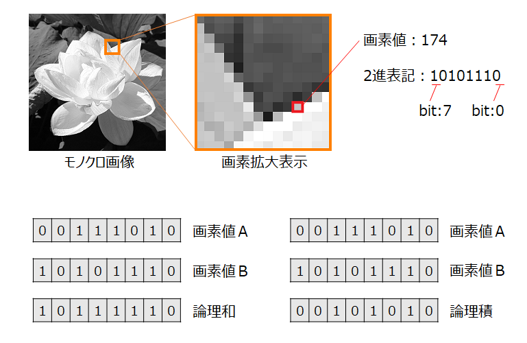 画像処理の論理演算では画素値の各ビットに対して演算を行います。
