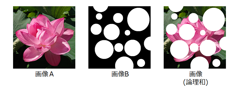 「画像B」の黒い部分の結果には変化がありませんでした。これは真理値表のとおり、画素値が0(黒い部分)との論理和では出力が変化しないためです。一方で、「画像B」の白い部分との論理和では白く塗りつぶされる結果になりました。