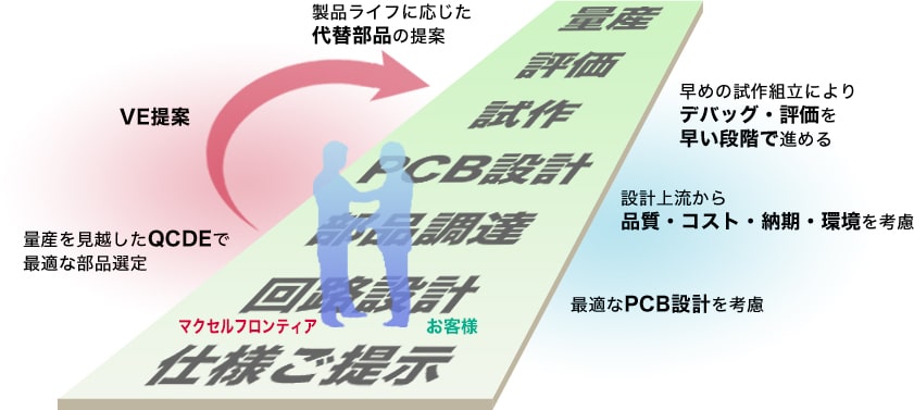 上流から設計に携わることによるVE提案、最適なPCB設計、試作〜評価〜量産を支援します!