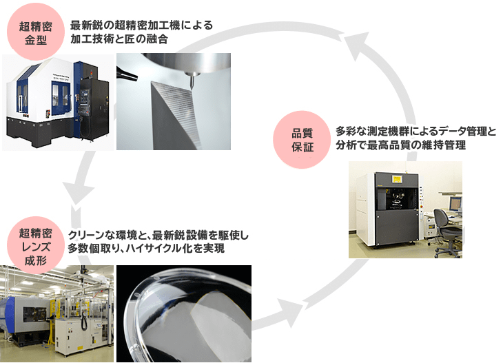 超精密金型技術と精密成形技術を駆使し、結像系の小径レンズから照明系の大径厚肉レンズまで、幅広いニーズに対応した生産体制を構築しています。また量産成形は海外でも対応しており、お客様のニーズに最適なご提案をいたします。