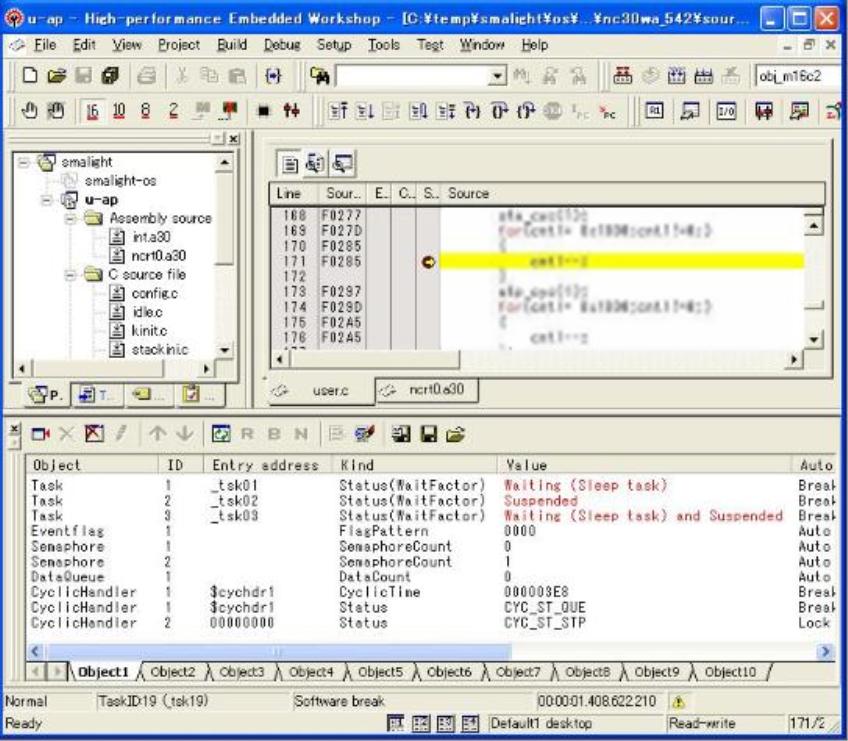 Smalight OSはルネサスエレクトロニクス株式会社 リアルタイムOS対応デバッグ機能で標準サポートされます。High-performance Embedded Workshop V.4.04.00以降には標準搭載、CS+(旧CubeSuite+)ではパートナーOS対応デバッグプラグインの導入によりタスクレベルデバッグが可能となります。