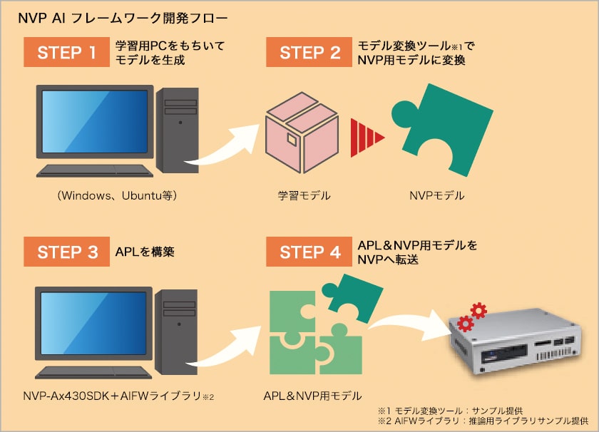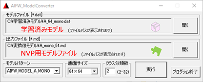 深層学習フレームワークで作成した、学習済みモデルをNVP用モデルファイルに変換できます。