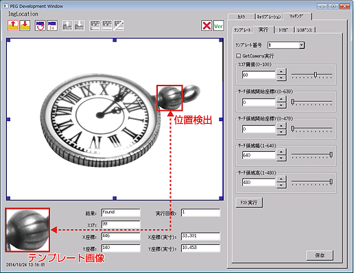 - マッチング(正規化相関)による、画像探索と位置算出に合わせて装置へのデーター出力