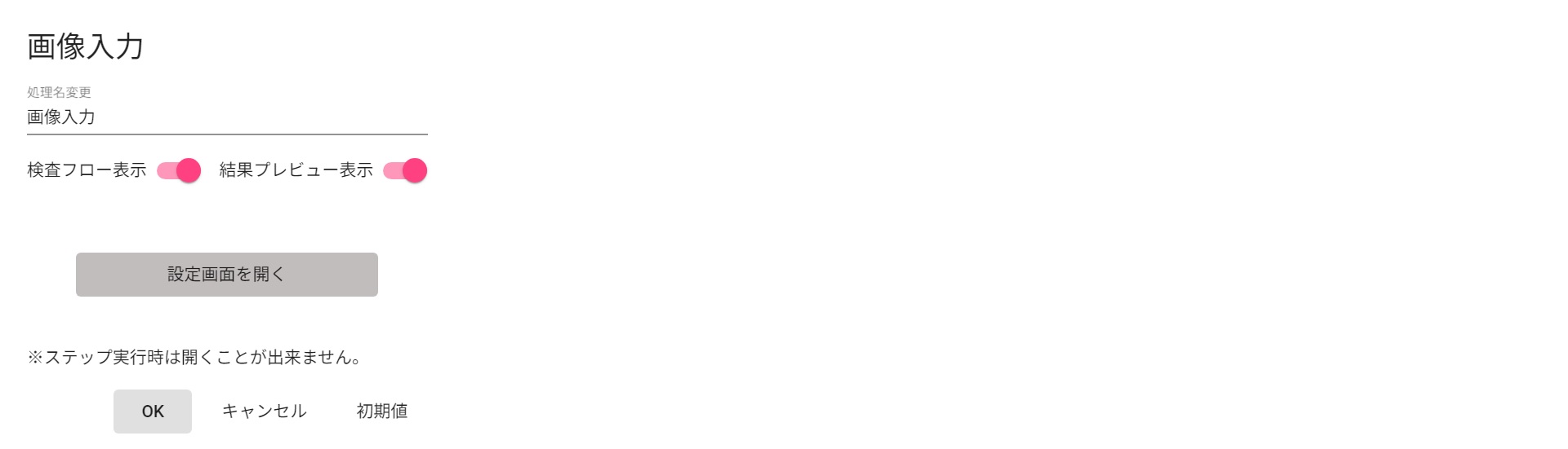 | トリガタイプ | カメラへのトリガ信号(シャッターを切るタイミング)を選択します 内部トリガ:画像入力部品が呼ばれたときにトリガ信号を出力します 外部トリガ:外部機器からの信号を元にトリガ信号を出力します |