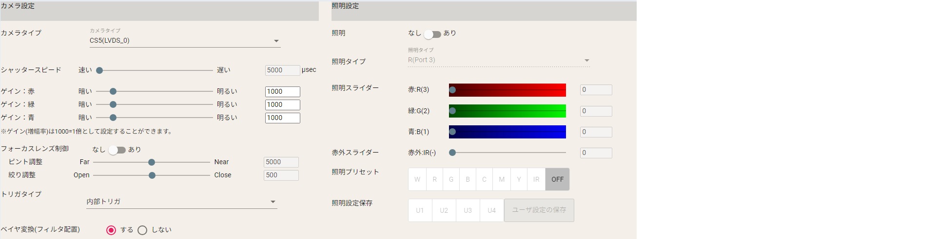 | 照明スライダー | 照明の発光時間をシャッタースピード(露光時間)に対する割合で指定します 例:シャッタースピードが10000usで照明スライダーが50の場合、5ミリ秒発光します |