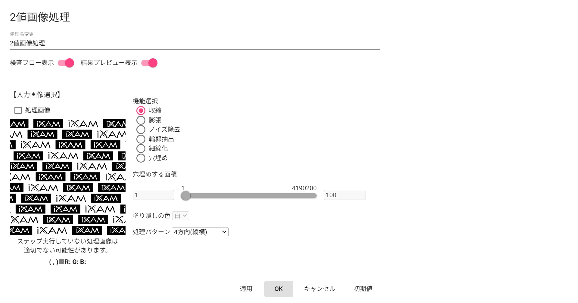 | プロパティ項目 | 穴埋めする面積 | 穴と判断された画素の面積が設定範囲内であれば穴埋めを行います |