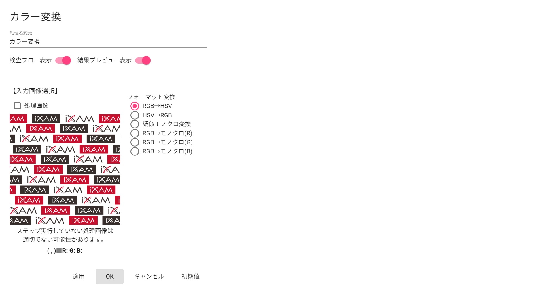 RGB→HSV:R(赤)、G(緑)、B(青)フォーマットからH(色相)、S(彩度)、V(明度)フォーマットへ変換します HSV→RGB:H(色相)、S(彩度)、V(明度)フォーマットからR(赤)、G(緑)、B(青)フォーマットへ変換します 疑似モノクロ変換:カラー画像をモノクロ画像へ変換します RGB→モノクロ(R):RGBのR成分を抽出してモノクロ画像へ変換します RGB→モノクロ(G):RGBのG成分を抽出してモノクロ画像へ変換します RGB→モノクロ(B):RGBのB成分を抽出してモノクロ画像へ変換します |