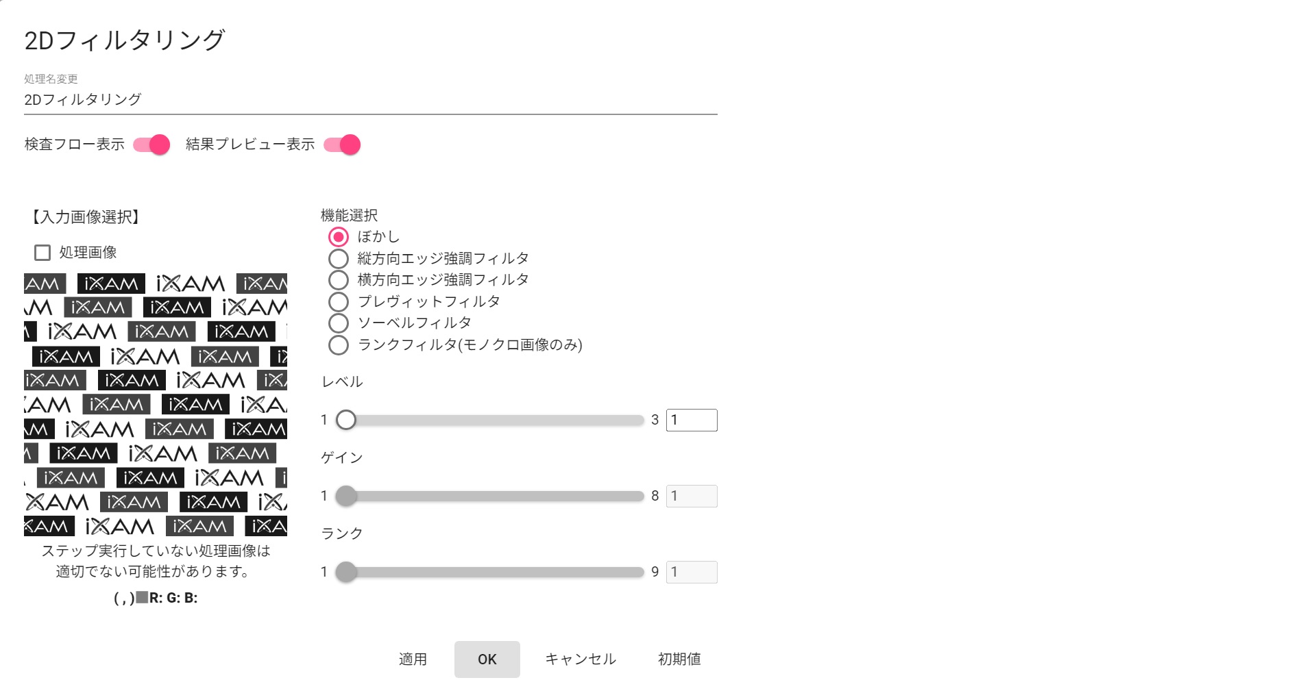 2Dフィルタリングに関する参考記事はこちら(ぼかしフィルタ・エッジフィルタ・ソーベルフィルタ・ランクフィルタ)。