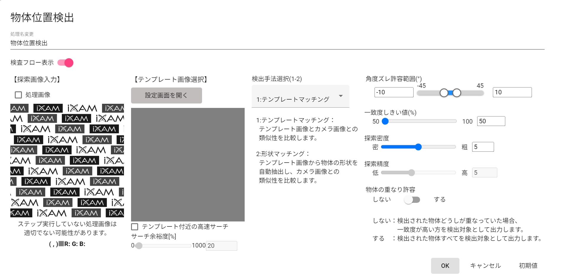 | 一致度しきい値(%) | 一致度はテンプレートと物体が類似している度合いで、一致度がしきい値以上である物体を検出します | |
