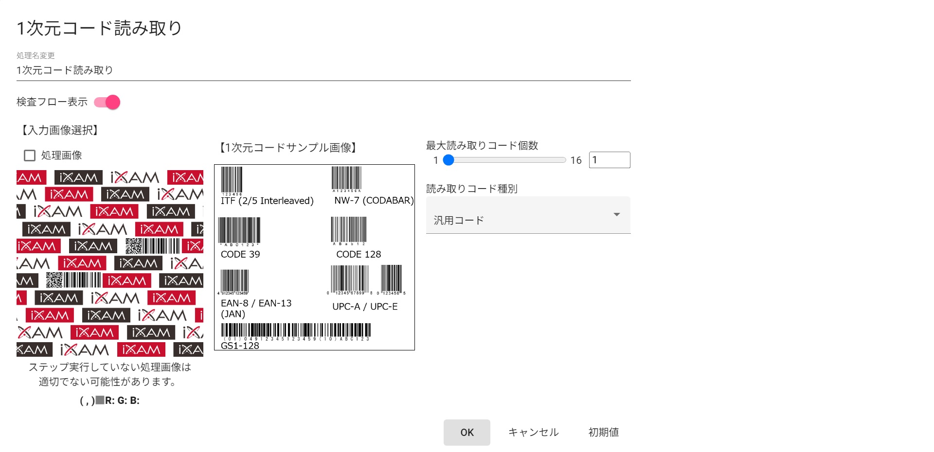 入力画像Aの指定領域内の1次元コードを読み取り、読み取り結果をパラメータで出力します。