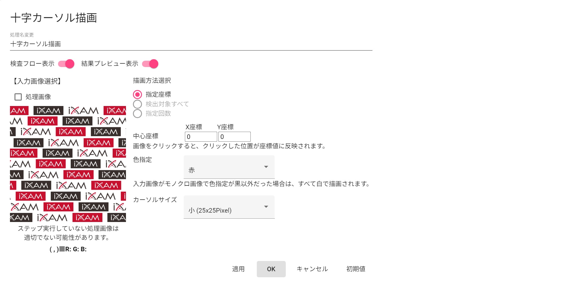 “指定座標”は、直接座標を指定して描画します “検出対象すべて”は、前方に配置されている部品が複数の座標を出力する場合、すべての座標に十字カーソルを描画します また、前方に配置されている部品の検索始点座標や検索終点座標に十字カーソルを描画します “指定回数”は、前方に配置されている部品が複数の座標を出力する場合、指定回数分の十字カーソルを描画します また、前方に配置されている部品の検索始点座標や検索終点座標に十字カーソルを描画します |