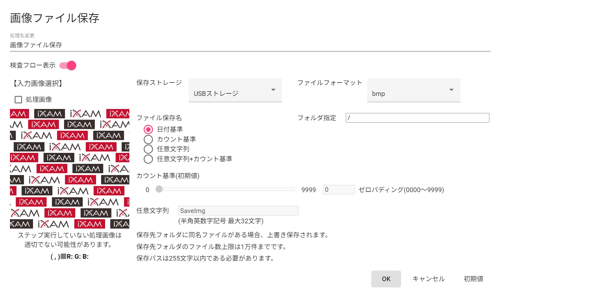 | カウント基準(初期値) | ファイル保存名に“カウント基準”または“任意文字列+カウント基準”を指定した場合のカウント初期値を指定します | |