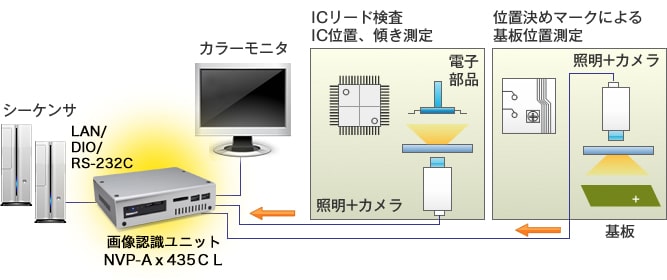 カメラ2チャネル同時取込み機能や、LAN、DIO、RS-232Cなどを用いて、簡易マウンタシステムを実現できます。